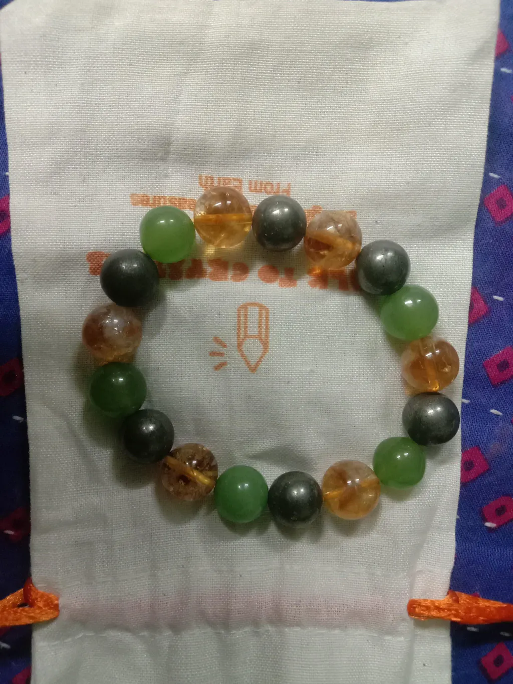This bracelet combines the benefits of a citrine bracelet, pyrite crystal bracelet, and green aventurine bracelet, to bring Luck, Abundance, Growth, and Wealth.