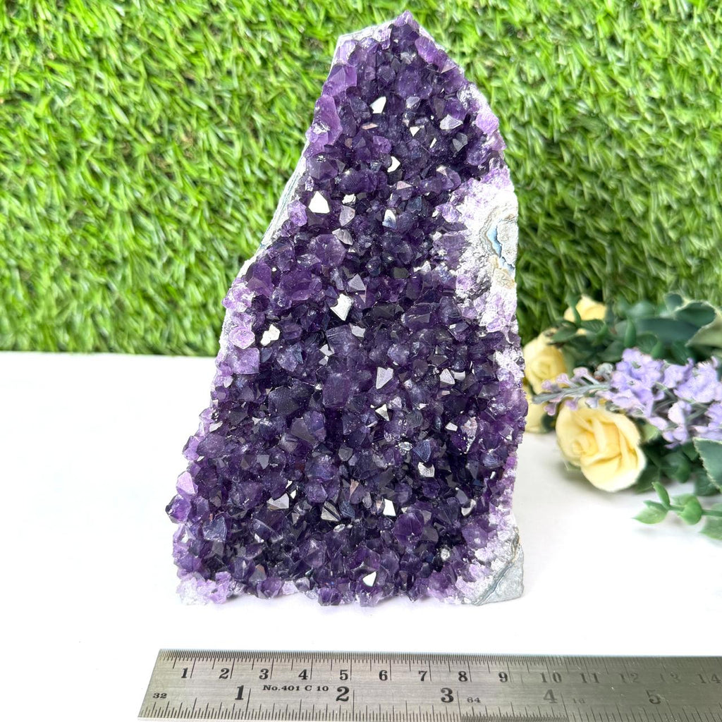 Very Superior and rare quality Amethyst Standing Clusters. These clusters can be placed standing due to their shapes. Some have polished sides. They can be used to focus energy using multiple points in any direction by intention. They are excellent for focused healing. Uruguay clusters usually have small points and are high-vibrating crystals. Amethyst eases mental stress and anxiety and helps to clear negative thoughts and restlessness. It is one of the best stones for meditation and healing. It brings wisdom to one's thoughts. It works with the third eye chakra and enhances intuition and psychic gifts. It is known to help in curing all kinds of addictions. It is a stone of 'spirituality and contentment. It is known as a master healer and is used for healing by energy healers. When used in cluster form, the energy of this stone is amplified and works in a larger area. The results can also be seen faster. Sizes and weights are approximate.