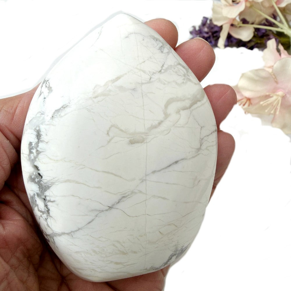 The Howlite free forms are shaped like a fixed flame. All the options are between 3.25 to 3.5 inches in height. Howlite is a stone of awareness, peace, and calm. It gives the strength to let go of unhealthy attachments and old emotional pains. It calms you if you are upset, and removes your anger. It can be for the treatment of anxiety disorders and other stress-related diseases. It is known to boost patience.