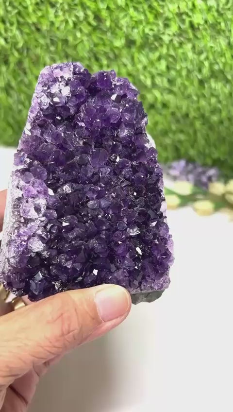 Very Superior and rare quality Amethyst Standing Clusters. These clusters can be placed standing due to their shapes. Some have polished sides. They can be used to focus energy using multiple points in any direction by intention. They are excellent for focused healing. Uruguay clusters usually have small points and are high-vibrating crystals. Amethyst eases mental stress and anxiety and helps to clear negative thoughts and restlessness. It is one of the best stones for meditation and healing. It brings wisdom to one's thoughts. It works with the third eye chakra and enhances intuition and psychic gifts. It is known to help in curing all kinds of addictions. It is a stone of 'spirituality and contentment. It is known as a master healer and is used for healing by energy healers. When used in cluster form, the energy of this stone is amplified and works in a larger area. The results can also be seen faster. Sizes and weights are approximate.