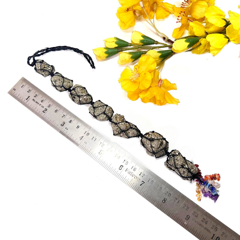 Seven Pyrite Rough Stones, which are actually mini clusters have been strung together in black thread to form a hanger with some mixed chips at the bottom. The total length, including the string, is approximately 30 to 35 cm. The length of the stones only, without the string, is 20 to 22 cm. These can be hung at one corner of any workspace to bring confidence, wealth, name, and fame. They can also be hung in any personal space while meditating. It is also an excellent way to keep the stones together, either by placing them in a bowl or directly on a table.