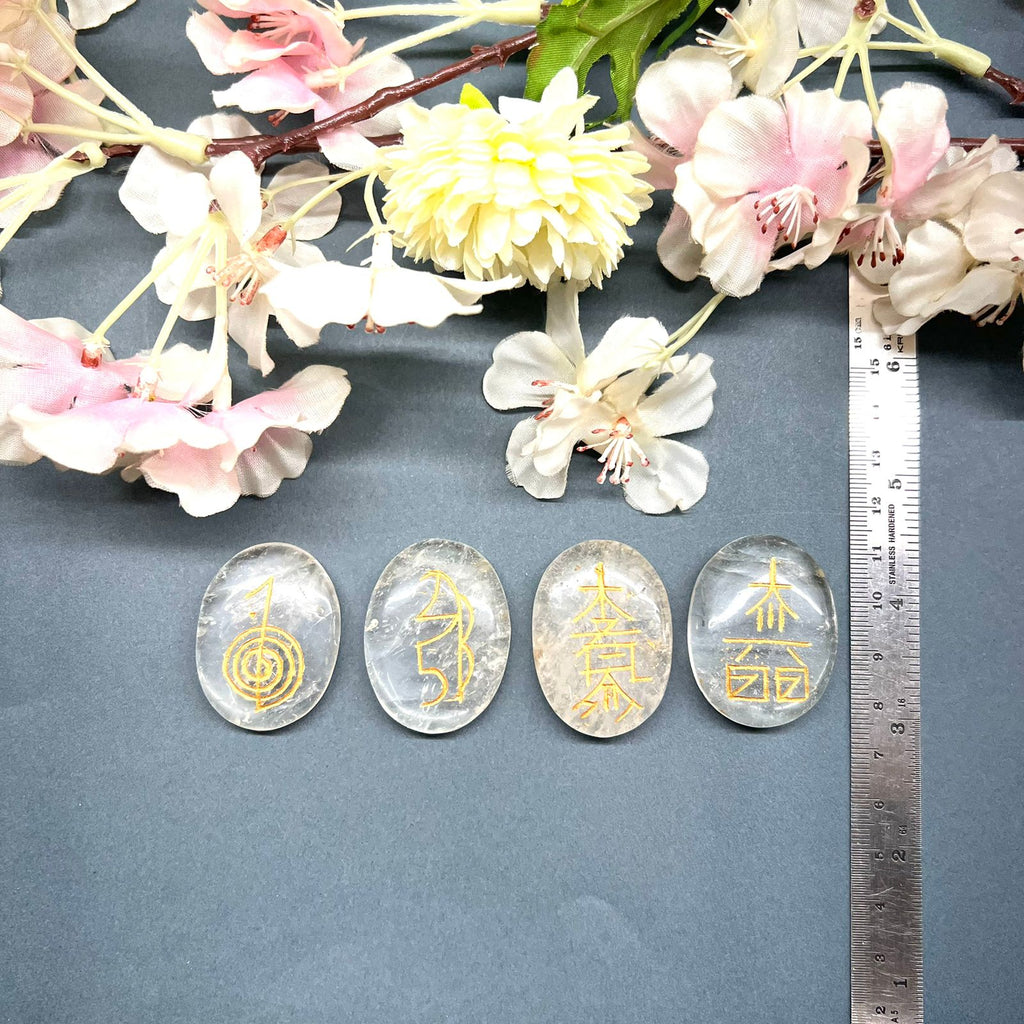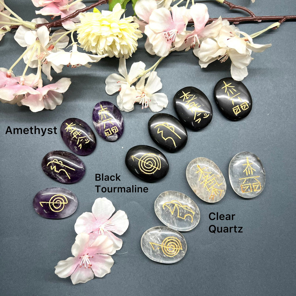 Set of four cabochons in Amethyst, Clear Quartz, and Black Tourmaline with Reiki healing symbols. The cabochons are excellent for healing as the crystal healing properties have been amplified with the symbol's energy. These can be used by reiki healers for healing. In case you are not familiar with reiki, the symbol will still do its healing work for you. These can be used in meditation as well as placed on the body for healing.