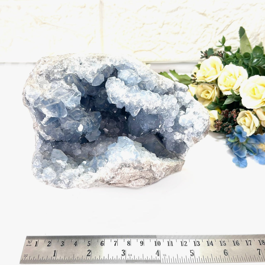 Large Celestite Clusters are not easily available due to the softness of the matrix they are found on. Some of the cluster options are of superior (AAA) quality. Clusters 1, 2, 5, 7, and 8 are AAA quality. Known as the angelic stone, Celestite connects you to the angels and guides you through dreams or meditation. Keeping it at your bedside helps in astral travel. It promotes spiritual development, and clairvoyance, and enhances intuition. It is a great stone to help with public speaking and communication. It helps to calm the mind of those who think too much. It is also one of the best stones to use in children’s bedrooms. The matrix or the soft earth holding the celestite together can easily break or dissolve in water. The properties of the crystal do not change in case this happens. Handle these with care and do not soak them in water.