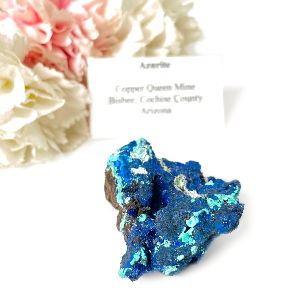 This Azurite specimen is from from the Copper Queen Mine in Bisbee, Arizona, USA. Azurite samples from the Copper Queen Mine are considered the global "gold standard" for the species due to their historical impact and unique aesthetic forms. Since the Copper Queen closed in 1975, new specimens are no longer mined. Current availability is limited strictly to "old collections," causing high-quality samples to be very sought after by collectors. This piece exhibits druzy crystalline azurite "roses", along with vibrant soft green malachite. We have sourced it from the Tucson Gem and Mineral show, USA 2023. It weighs approximately 35.4 gms.