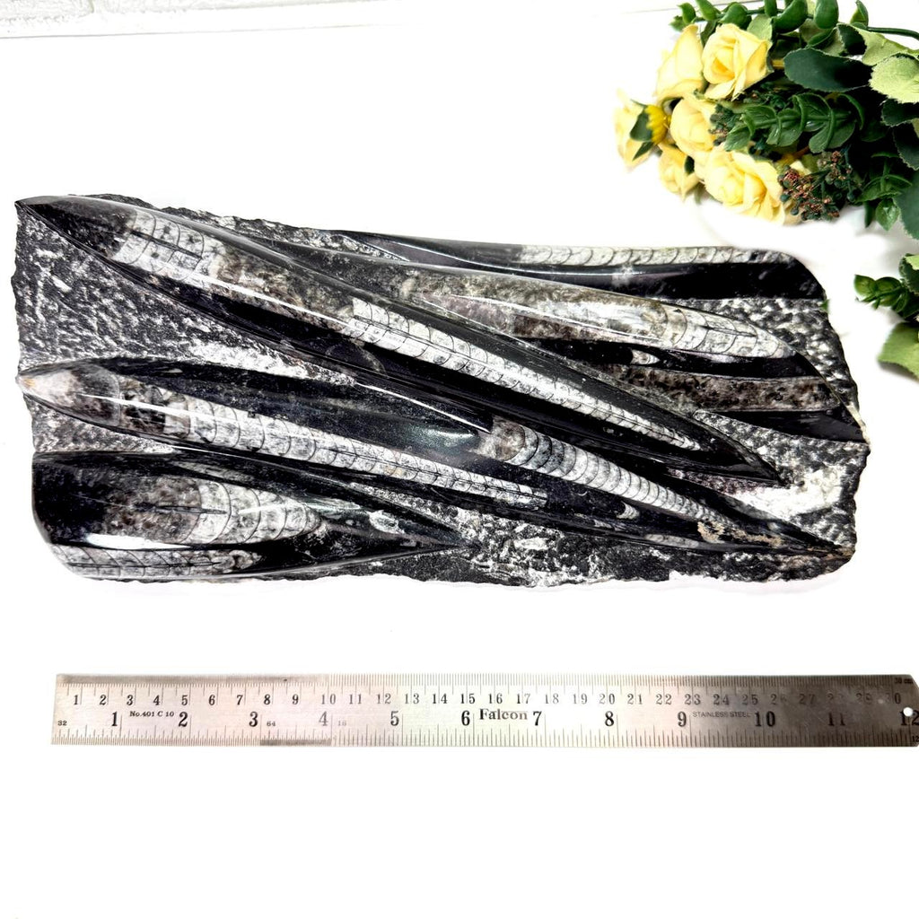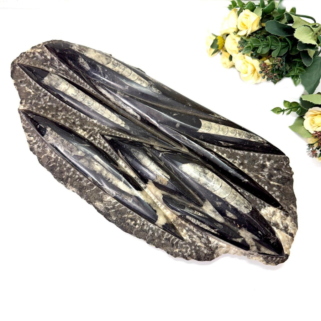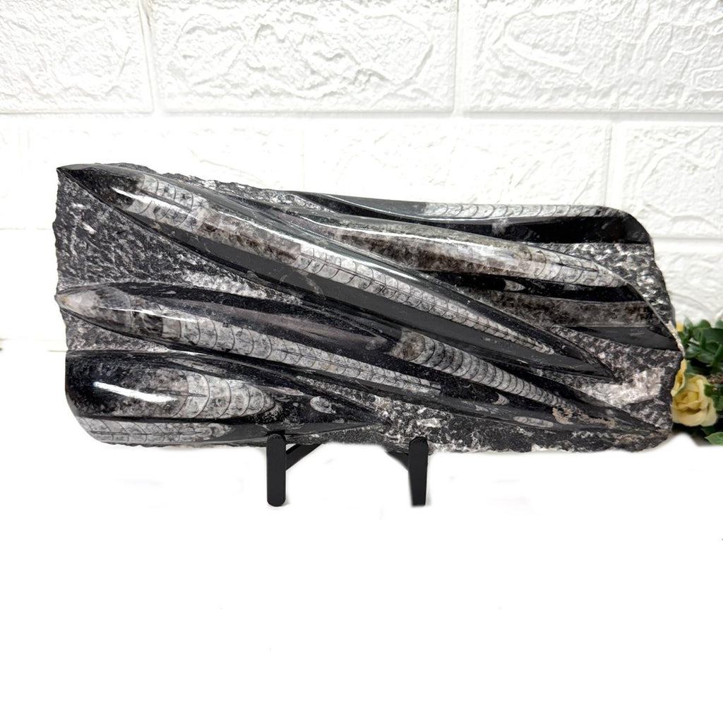 These Orthoceras plates have been placed on a metal stand. The stand is separate and is not attached to the plate. Orthoceras, also known as kuber stone, gives strength and stability in finances as well as in physical health. It connects us to the earth's energy and is a root chakra stone. It helps in grounding and activating the root chakra. It is excellent to use during new beginnings or periods of personal growth. It opens up a path of transformation for us. In ancient times, an orthoceras was worn as a talisman to increase life span. Placing these in a room or a building will bring financial stability.