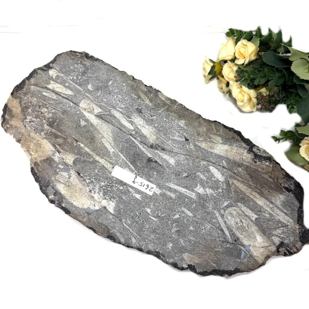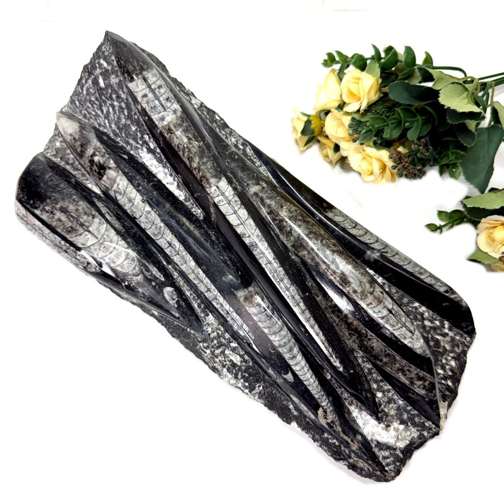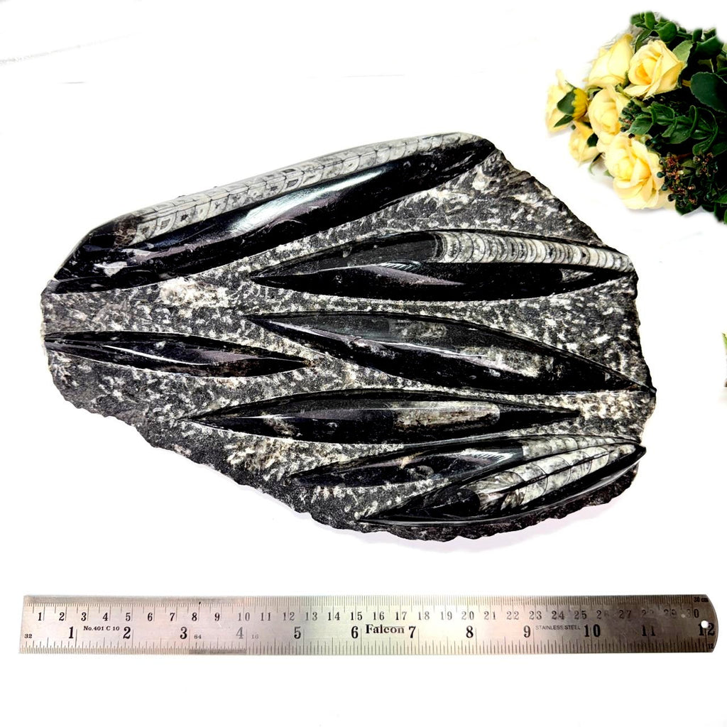 These Orthoceras plates have been placed on a metal stand. The stand is separate and is not attached to the plate. Orthoceras, also known as kuber stone, gives strength and stability in finances as well as in physical health. It connects us to the earth's energy and is a root chakra stone. It helps in grounding and activating the root chakra. It is excellent to use during new beginnings or periods of personal growth. It opens up a path of transformation for us. In ancient times, an orthoceras was worn as a talisman to increase life span. Placing these in a room or a building will bring financial stability.