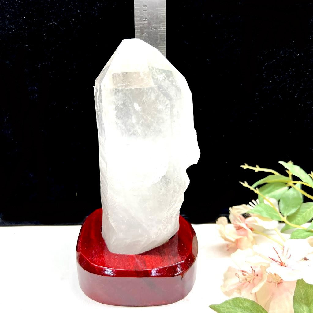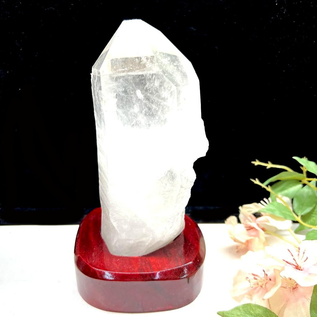 Large Lemurian Clear Quartz on a Wooden Stand