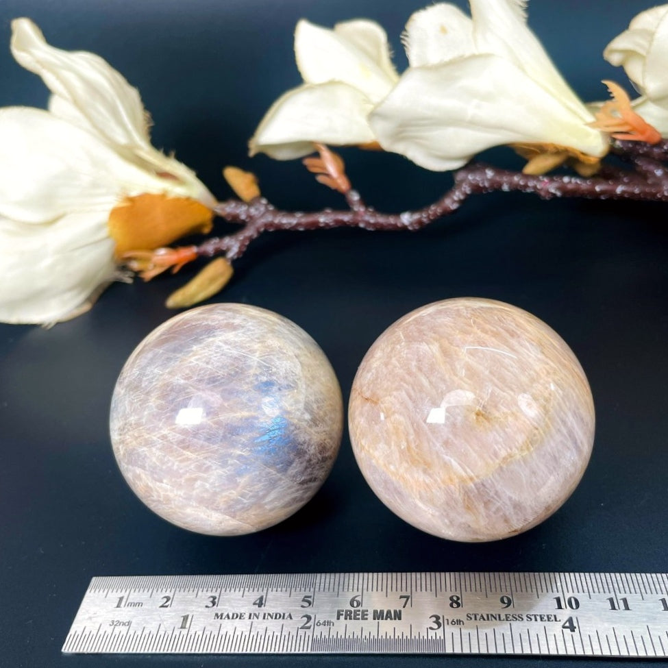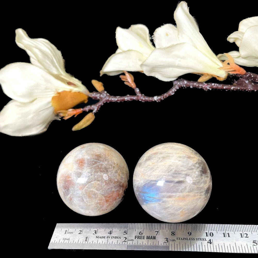 When held at an angle, one can see the blue flash or fire (labradoresence) in most of the spheres. There is also presence of sunstone in some spheres. There is also presence of more moonstone colours like grey, black, peach.