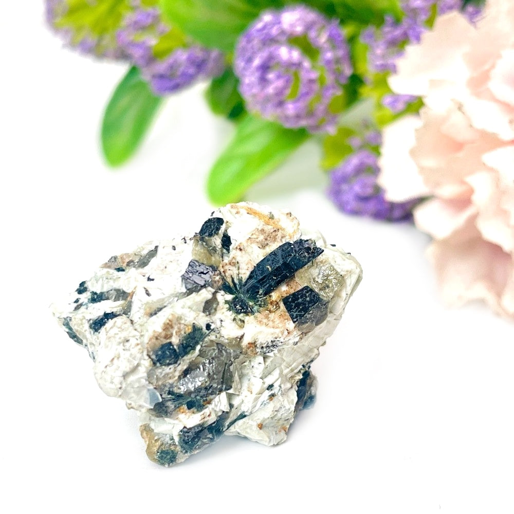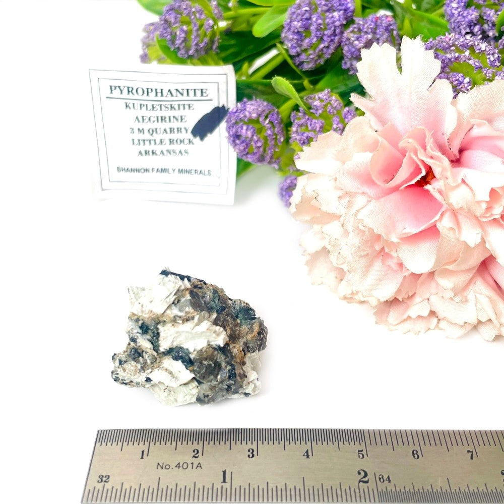 These Pyrophanite specimen are from Little Rock, Pulaski County, Arkansas, USA. The site is a renowned locality among mineral collectors for the rare, accessory minerals. These pieces contain Kupletskite and Aegerine Minerals on a feldspar matrix as well, which make these very desired amongst collectors. These belonged to the famous Shannon Family Collection. We have sourced it from the Tucson Gem and Mineral show, USA 2024.