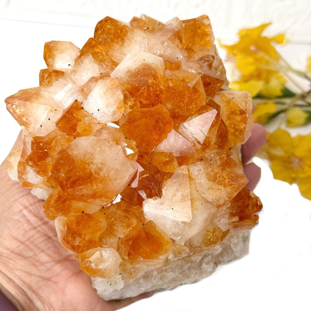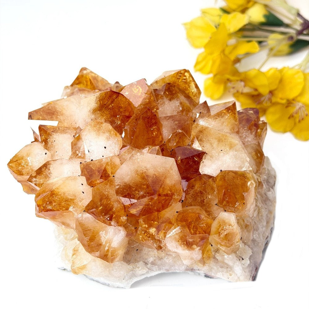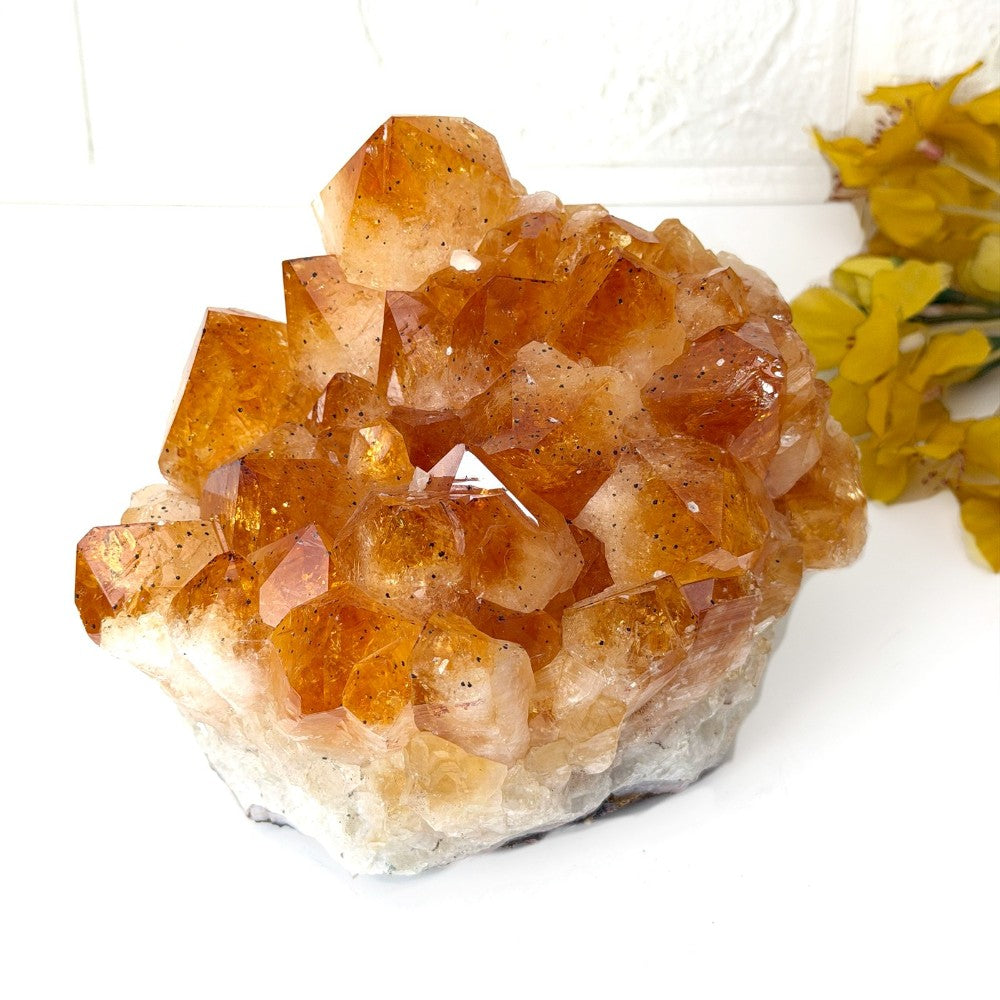 Citrine is a stone of warm energy and brings optimism. It brings professional and career growth and works on material abundance. It is called the manifestation stone and clears any negativity without absorbing it. It also helps remove fears and anxieties and builds self-confidence. A Citrine cluster can also be used as a clearing and charging space for your other crystals.