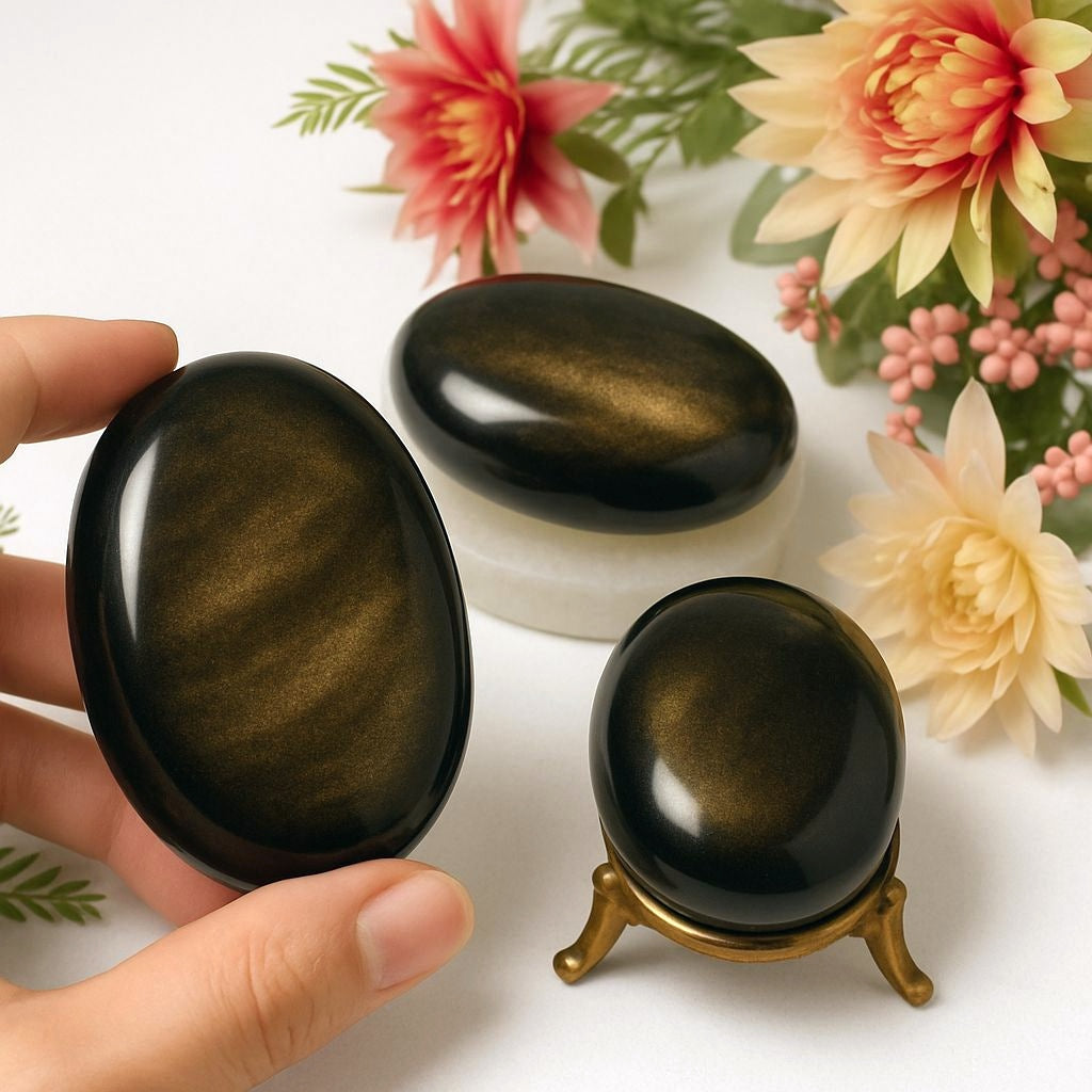 Golden sheen obsidian like other Obsidians is made of molten lava. The golden sheen is a result of the gases and minerals trapped within at that time. It is a protection stone with added healing properties. It helps to look within and remove all past issues and heal them. It is a protection and grounding stone that protects the user from psychic attacks and hooks or any kind of negative energy. It is used by psychics for gazing and is a healing magnifier crystal. It is particularly useful for clearing blockages of the Solar Plexus Chakra, the seat of our will power.