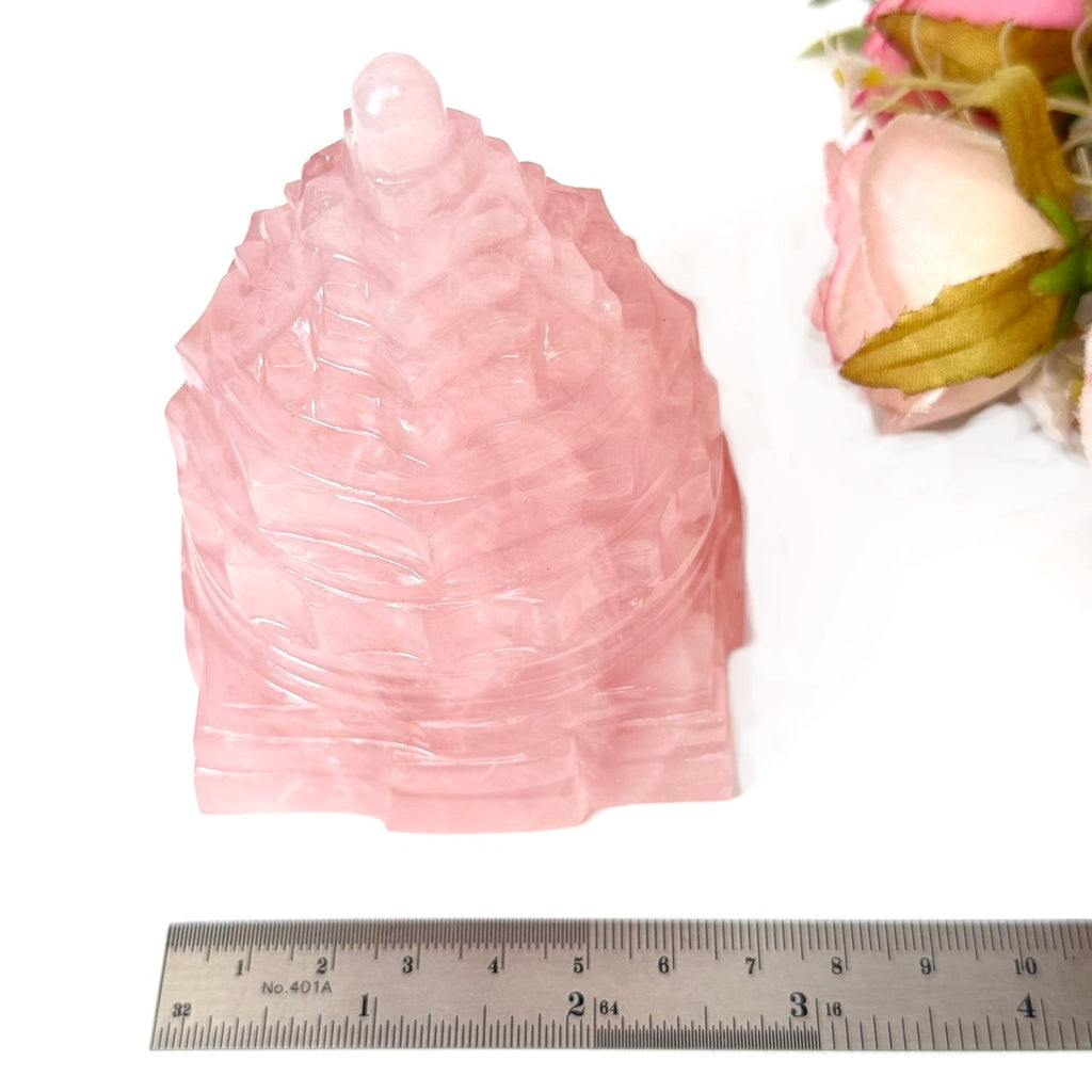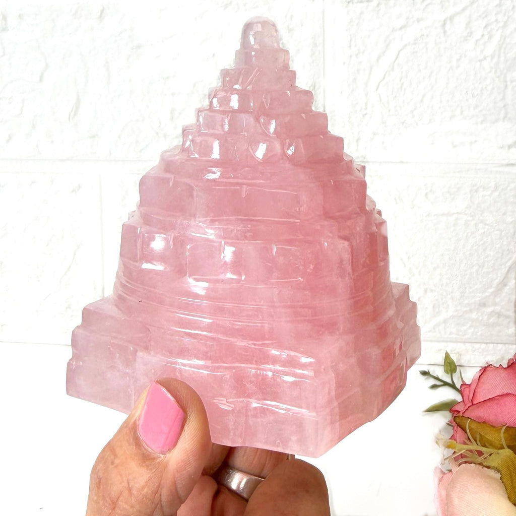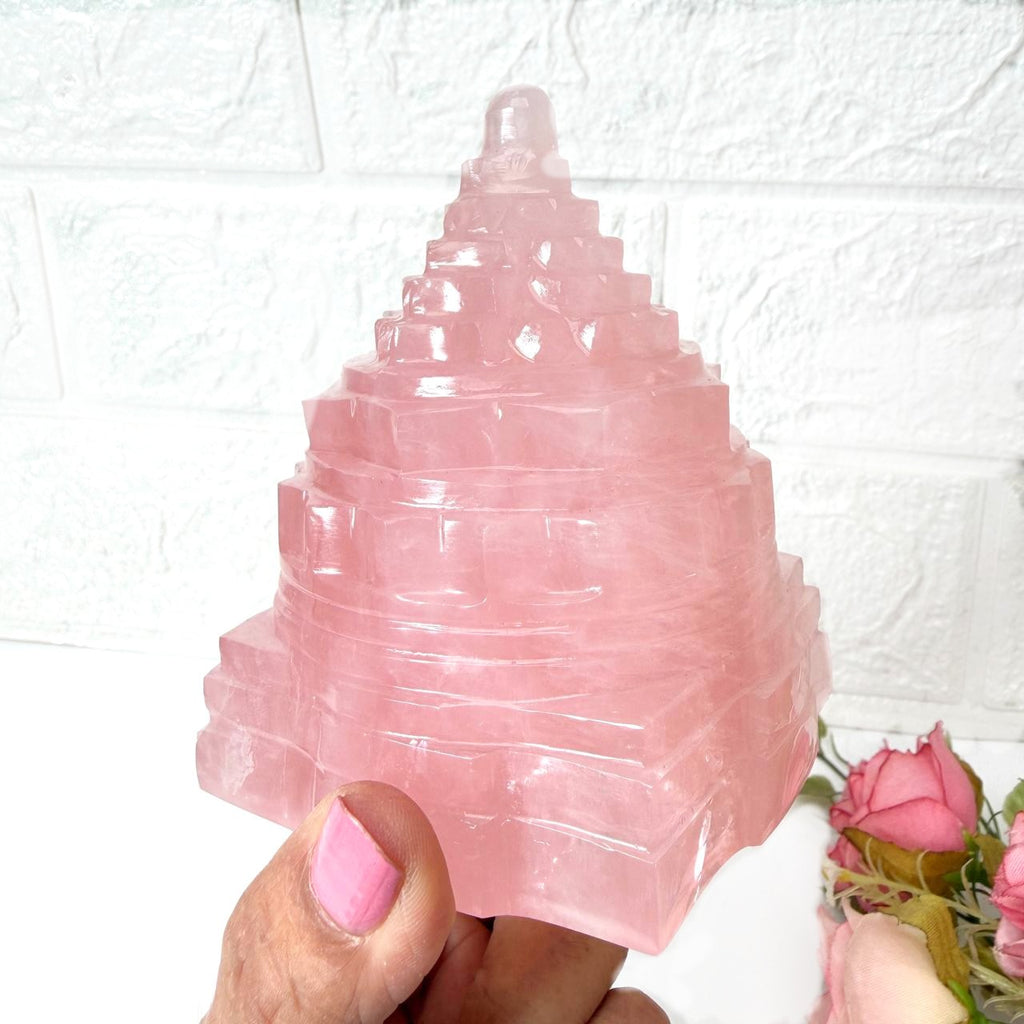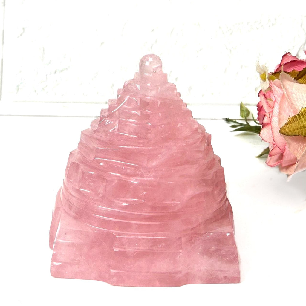 Rose Quartz Shri Yantra G (839 g; height-11.5 cm; base-7.8 cm)