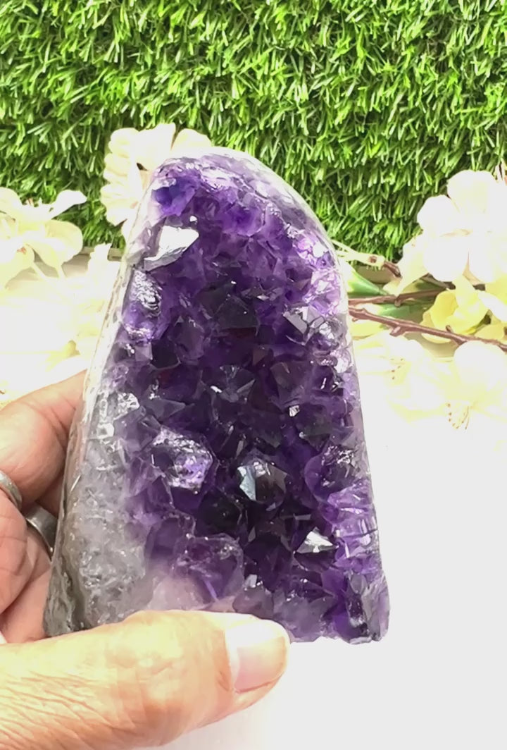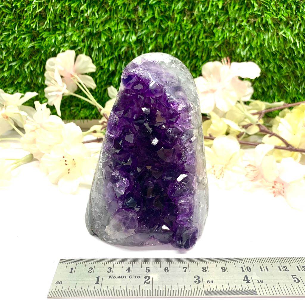 Very Superior and rare quality Amethyst Standing Clusters. These clusters can be placed standing due to their shapes. Some have polished sides. They can be used to focus energy using multiple points in any direction by intention. They are excellent for focused healing. Uruguay clusters usually have small points and are high-vibrating crystals. Amethyst eases mental stress and anxiety and helps to clear negative thoughts and restlessness. It is one of the best stones for meditation and healing. It brings wisdom to one's thoughts. It works with the third eye chakra and enhances intuition and psychic gifts. It is known to help in curing all kinds of addictions. It is a stone of 'spirituality and contentment. It is known as a master healer and is used for healing by energy healers. When used in cluster form, the energy of this stone is amplified and works in a larger area. The results can also be seen faster. Sizes and weights are approximate.
